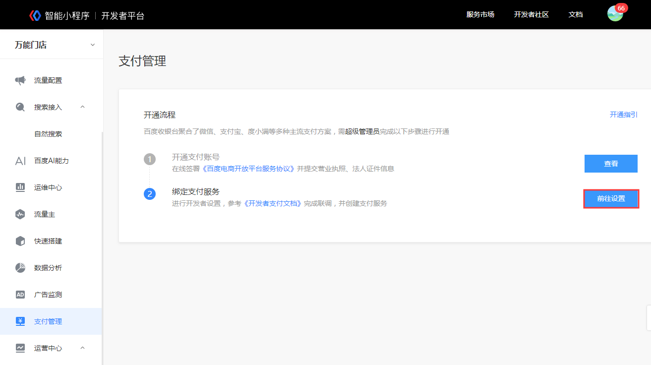 一、登录百度小程序管理平台,绑定支付服务