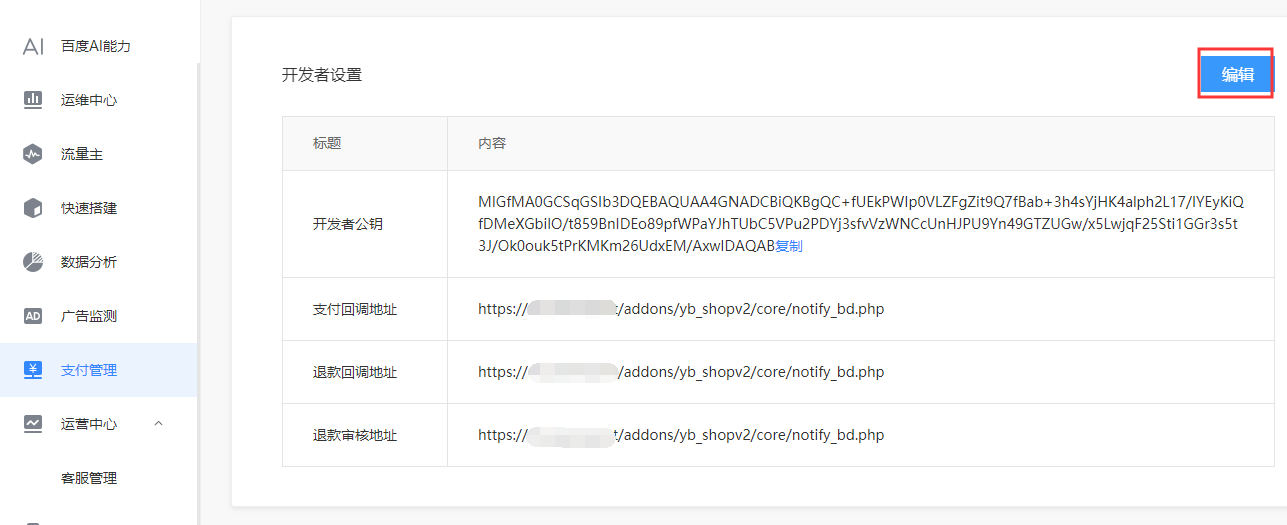 在百度小程序管理平台,点击【支付管理】菜单,找到【开发者设置】,点击右侧的【编辑】按钮