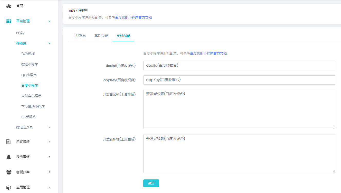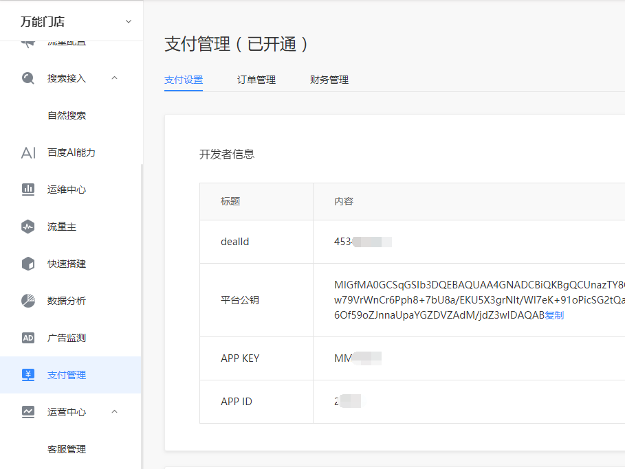 五、同时从百度小程序管理平台将dealId、appKey、平台公钥信息复制到【百度支付】页面中,【确定】保存即可
