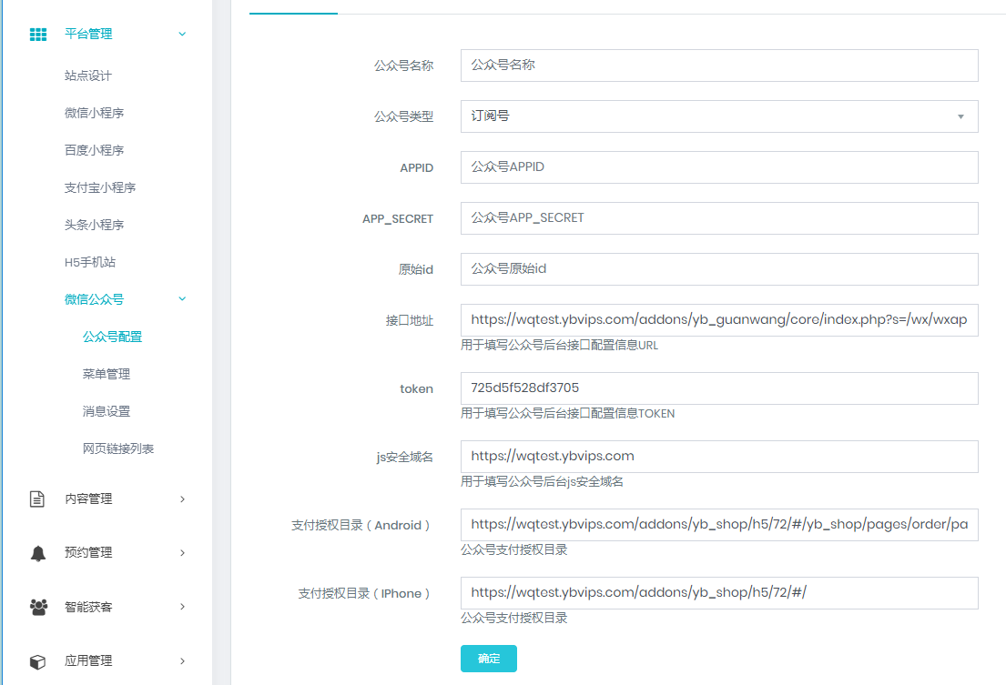 二、打开轻站后台的公众号配置页面,填写公众号相关的信息,名称、APPID、密钥(APP_SECRET)、原始ID等等。