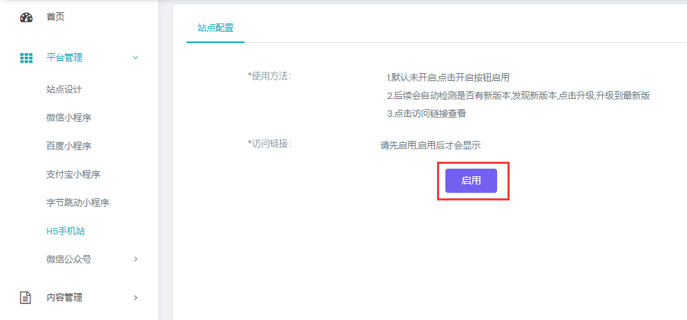 如图所示,打开公众号页面时会提示404,原因有两种: 一、H5手机站没有开启,打开H5手机站的站点配置页面,点击“启用”按钮即可 二、如果H5手机站点已经启用的话,如果登录宝塔服务器面板查看相关的文件夹有没有写入权限,权限设置后,删除H5文件夹,登录轻站后台启用H5页面功能即可。