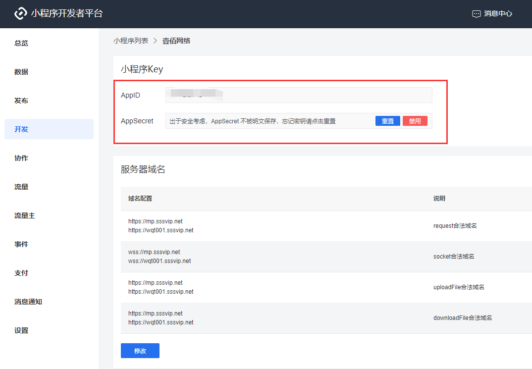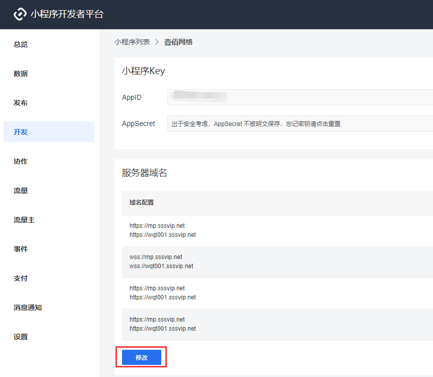第一步、登录字节跳动小程序开发者平台,打开“开发”页面,设置服务器域名