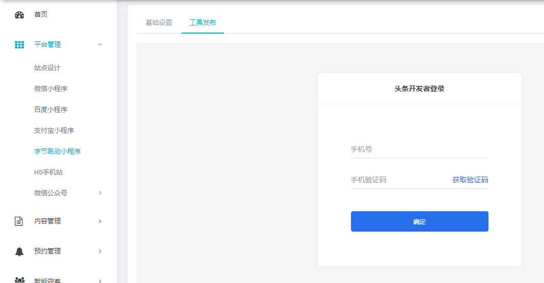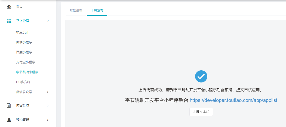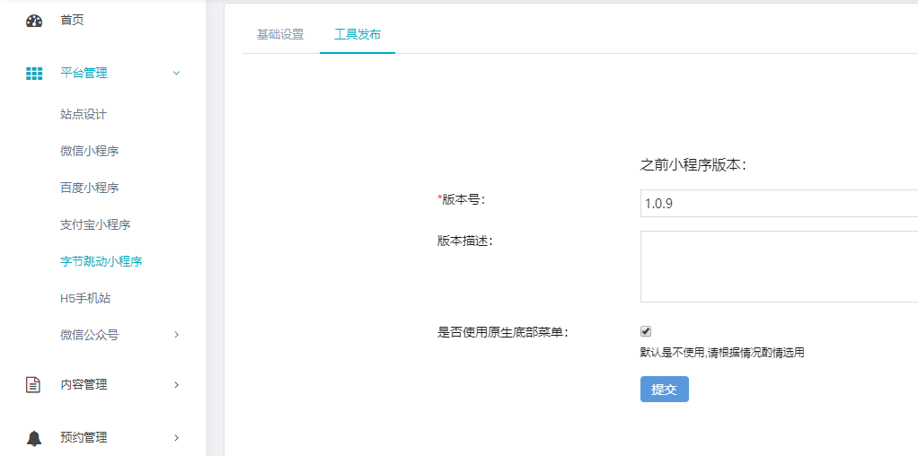 轻站后台,打开字节跳转小程序的“工具发布”页面,填写版本号,点击提交按钮,上传小程序