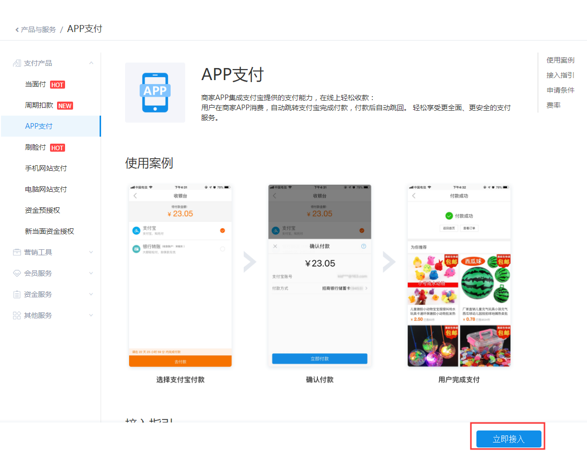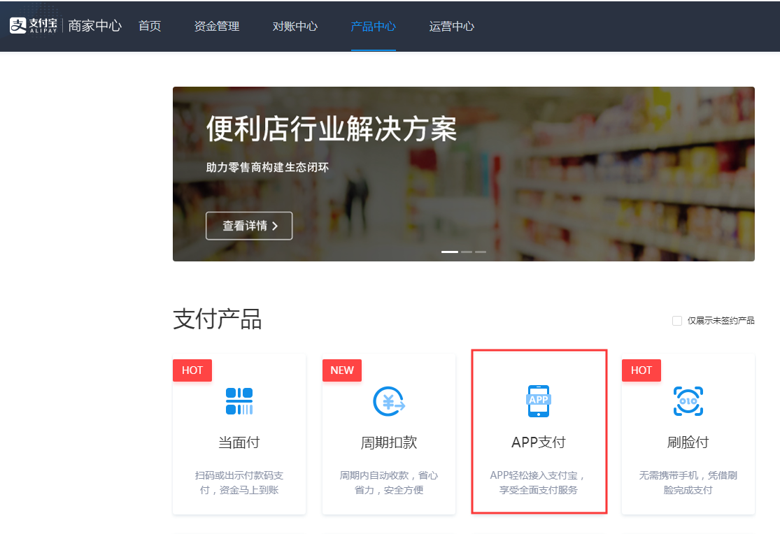 登录支付宝【商家中心】-【产品中心】https://b.alipay.com/,点击【APP支付】