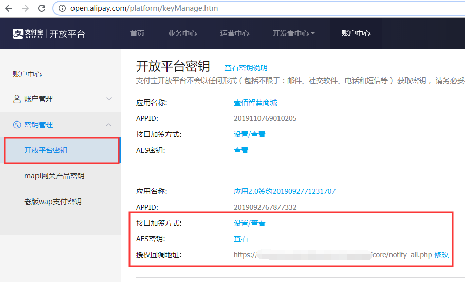 二、登录支付宝开放平台https://open.alipay.com/,点击页面右上角,设置APP支付的加签名方式以及相关的密钥。(提示,加签模式:公钥)