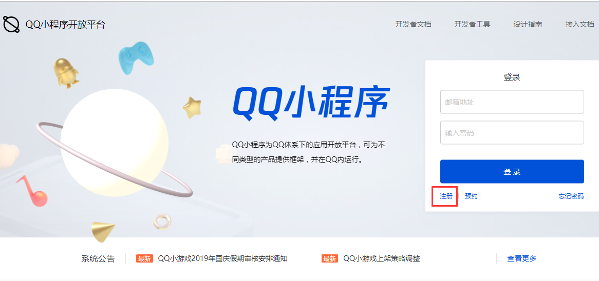 请在QQ小程序开发者平台首页 https://q.qq.com 点击右上角的「注册」按钮。注册流程中需要完成下列事项:
