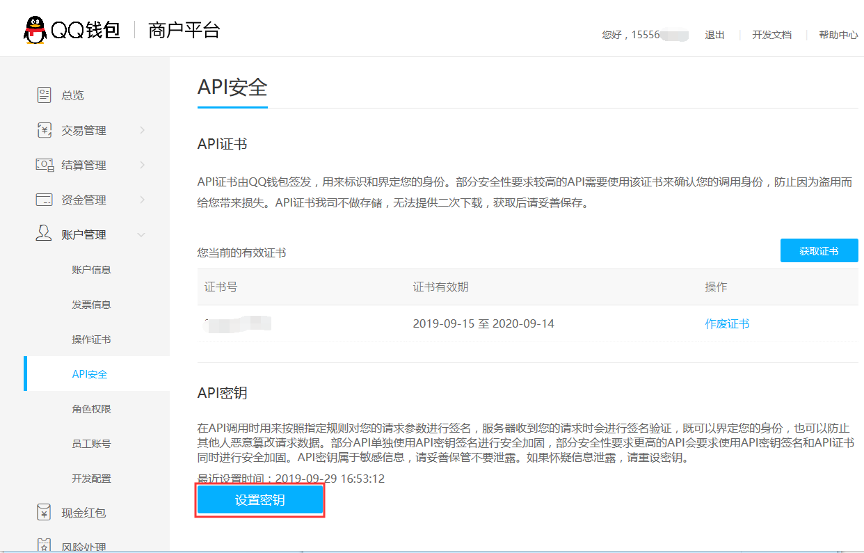 登录【QQ钱包-商户平台】,点击【账户管理】-【API安全】可设置支付密钥。