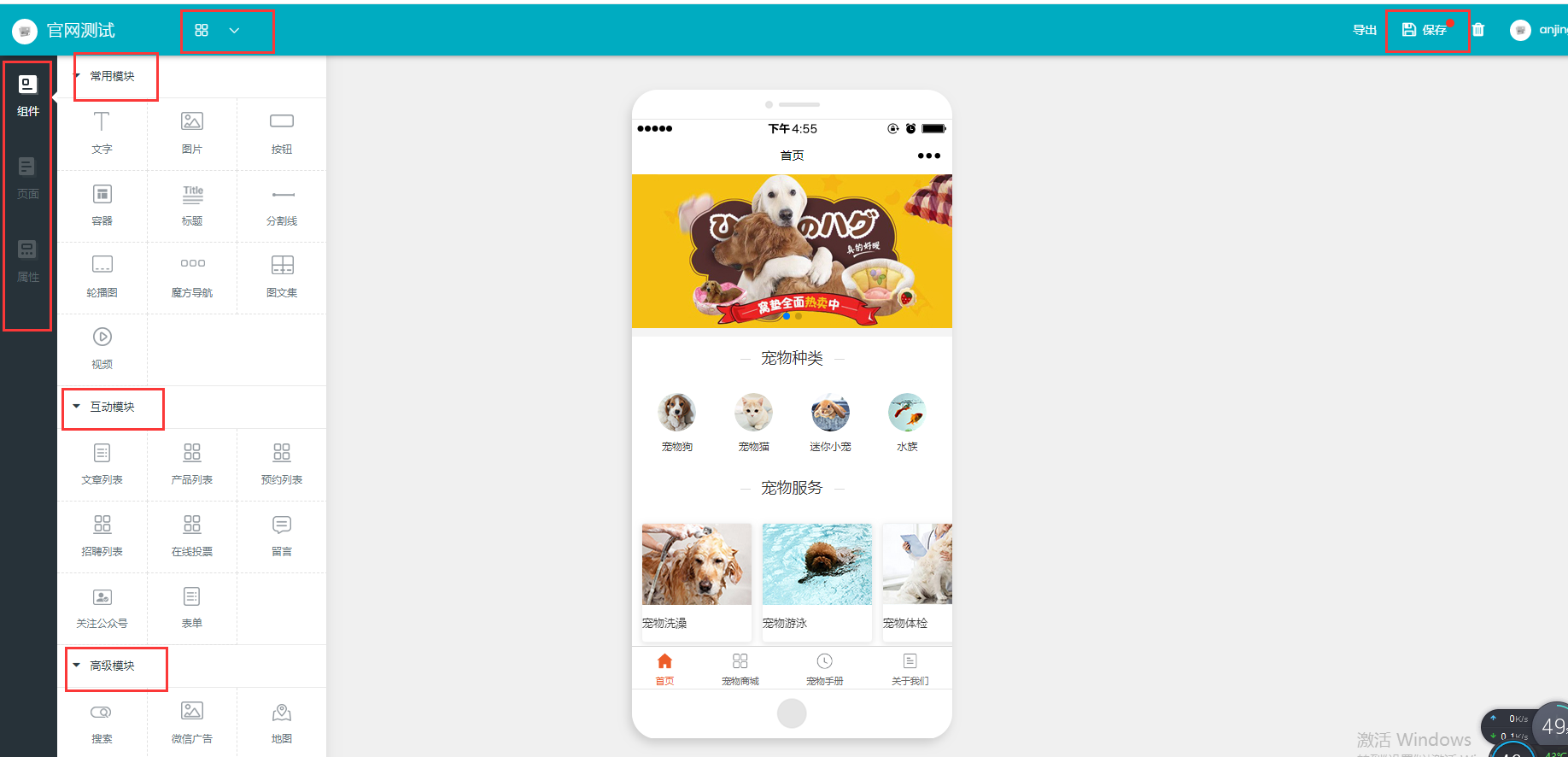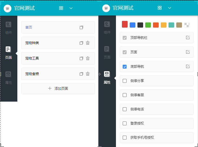 主页面分为三部分,左侧功能导航栏,中间设计区域 ,右侧的属性区域(此区域需要在设计区域选择相应的设置模块时候才可以显示)左侧功能栏分组件、页面、属性