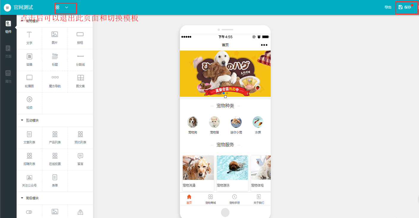 点击更换模板根据需要挑选模板,更改模板后原模板数据清空,设置成功后需要点击右上角保存后再退出