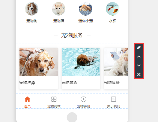 选中模板时右侧出现的的四个小标识(下图所示)从上到下分别是编辑、向上调整、向下调整,删除