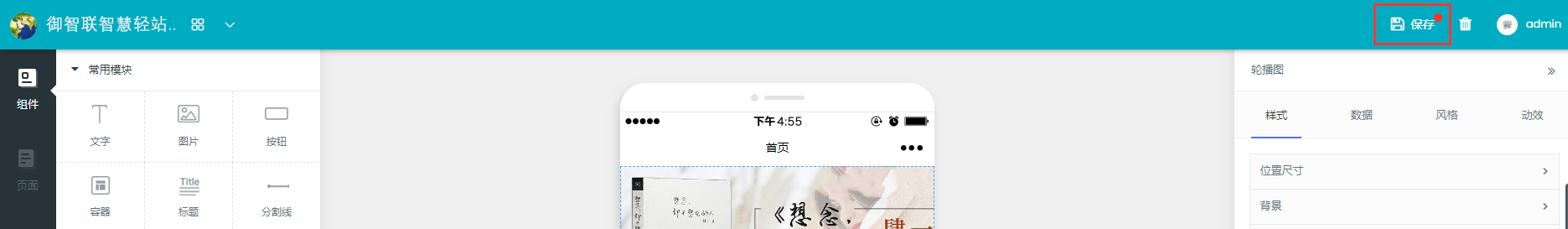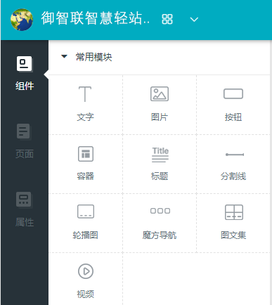 (常用模块主要包括文字、图片、按钮、容器、标题 、分割线、轮播图、魔方导航、图文集、视频等模块)