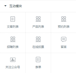 互动模式主要包括文章列表、产品列表、预约列表、招聘列表、在线投票、留言、关注公众号、表单等模块