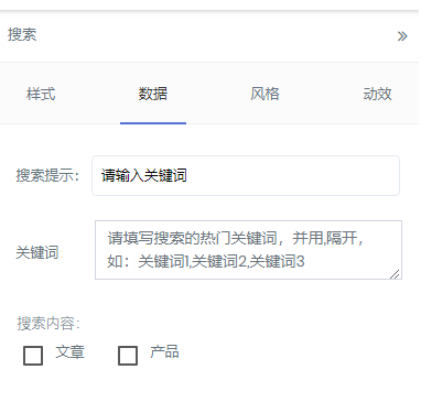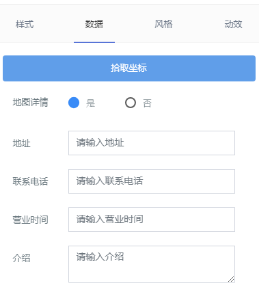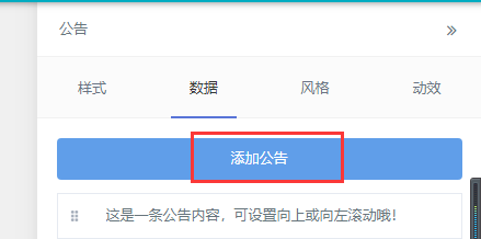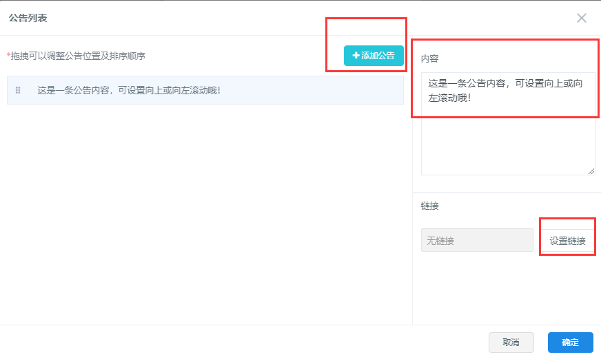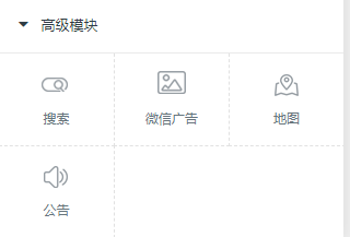 (高级模块主要由搜索、微信广告、地图、公告等组成) 搜索 搜索数据填写的时候需注意关键词、搜索内容 微信广告 地图 公告 上图为公告的数据填写,可通过添加公告进入图片右边的页面进行添加公告、内容更改、设置链接