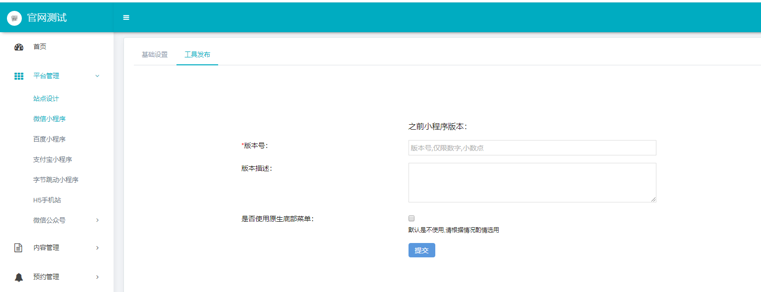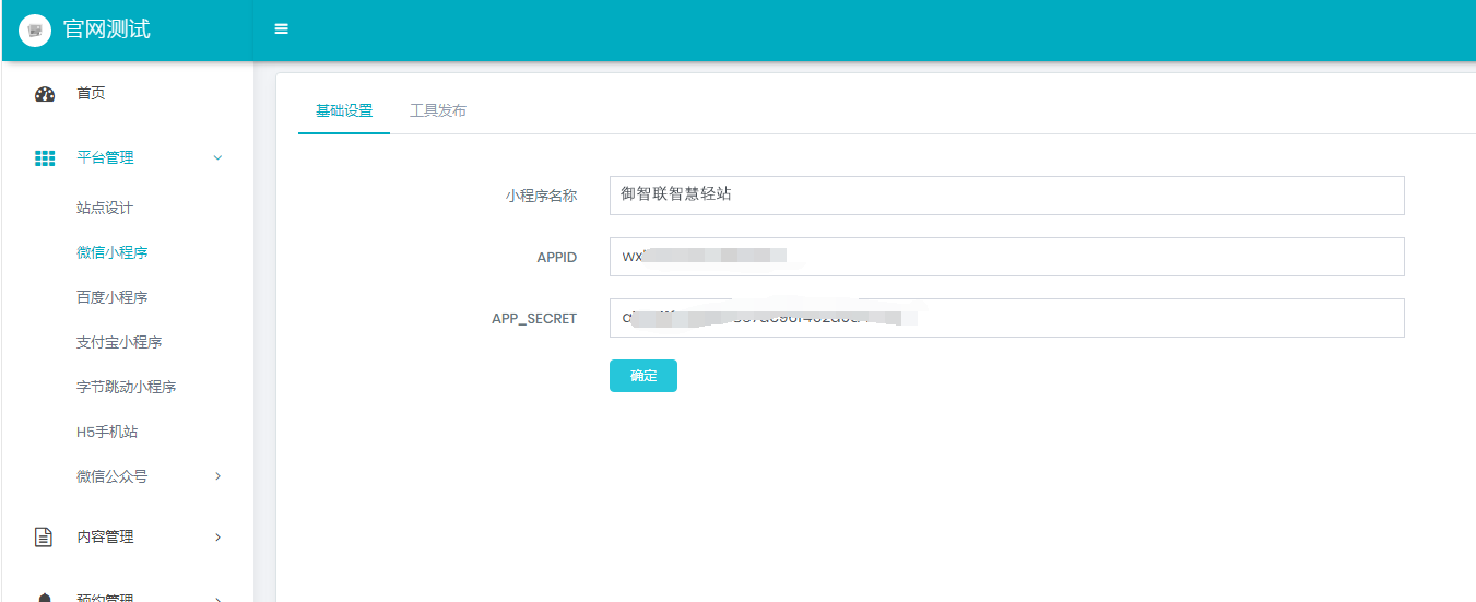 微信小程序(小程序发布)包括基础设置和工具发布 基础设置: 需要填写相应的数据(APPID、APP_SECRET数据获取可参考一、御智联智慧轻站操作手册的微信小程序相关) 基础设置填写完成后点击确定进行保存 然后切换到工具发布界面填写完点击提交,根据提示进行操作验证即可