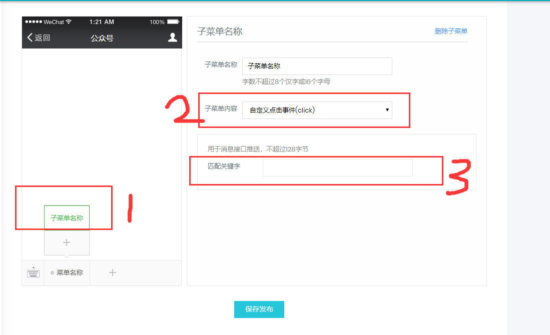 在“消息设置”里增加好关键字,跳转到菜单页面进行设置(如上图)