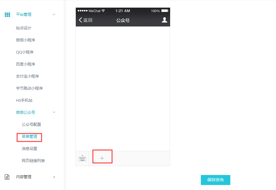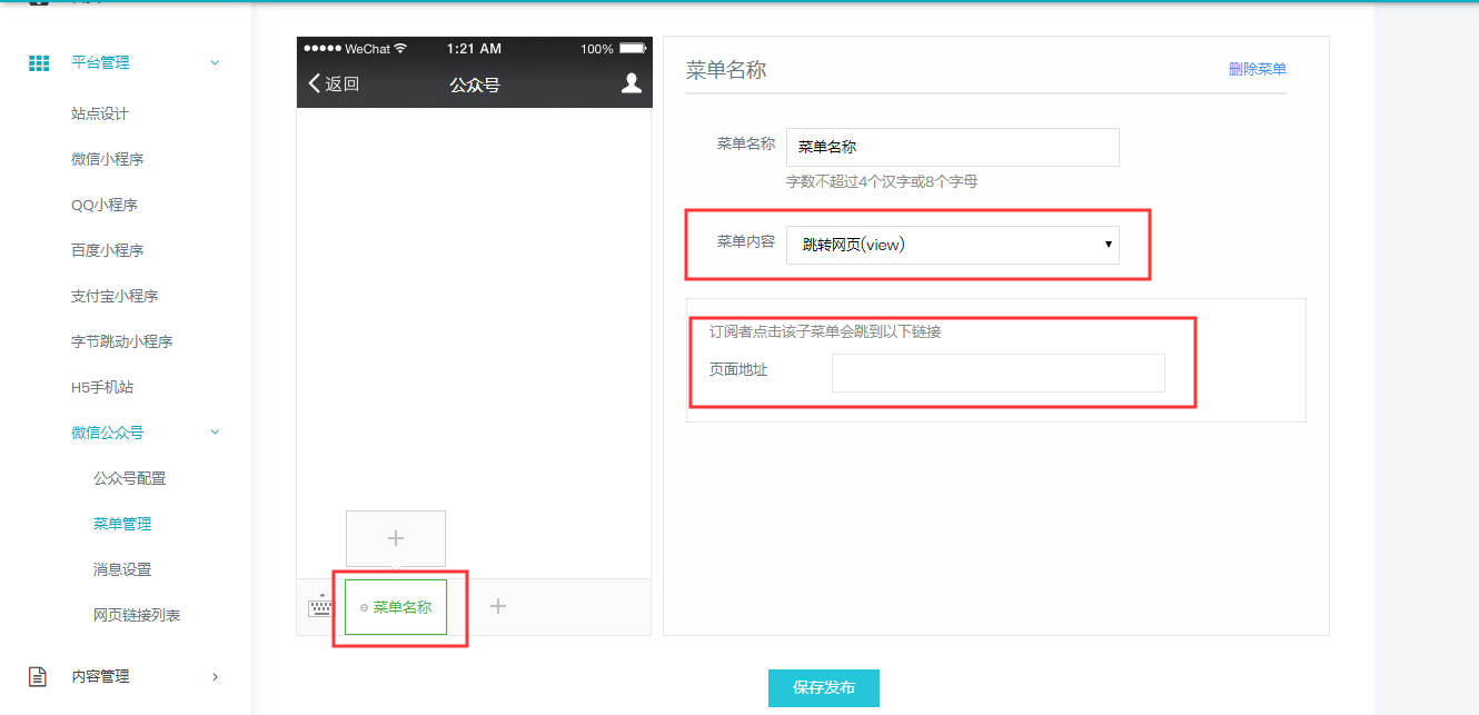 第三步:“菜单管理”—点击需要链接的菜单,在右侧修改“菜单名称”“菜单内容”,在“菜单内容”中,选择跳转网页,将复制的网页连接,粘贴到“页面地址”。