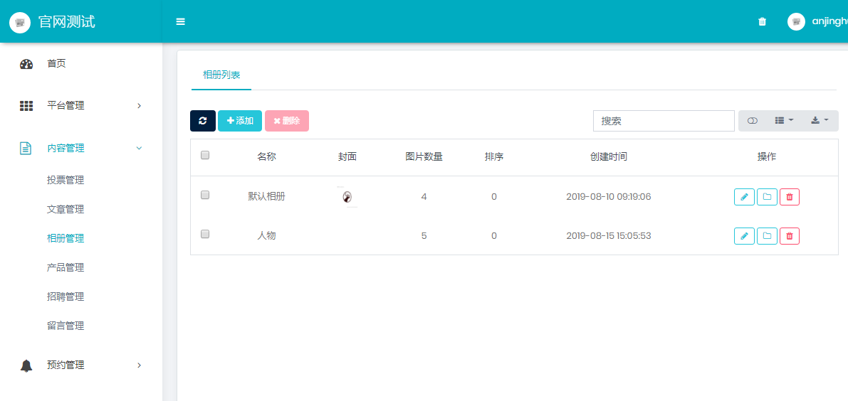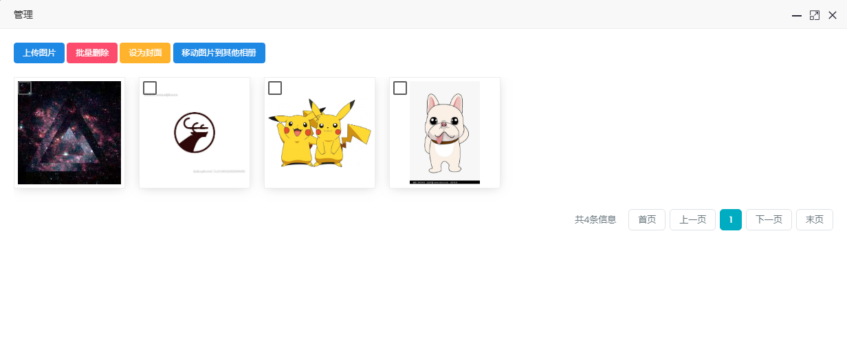 相册管理 可以创建、编辑、管理、删除相册,相册的主要作用在于方便商品图片的管理。 相册列表可查看已创建的相册名称、封面、图片数量、添加时间等,还可对相册进行改名、删除等操作。 点击管理可以在在此相册上传图片,批量删除,设置封面,移动图片到其它相册等功能。
