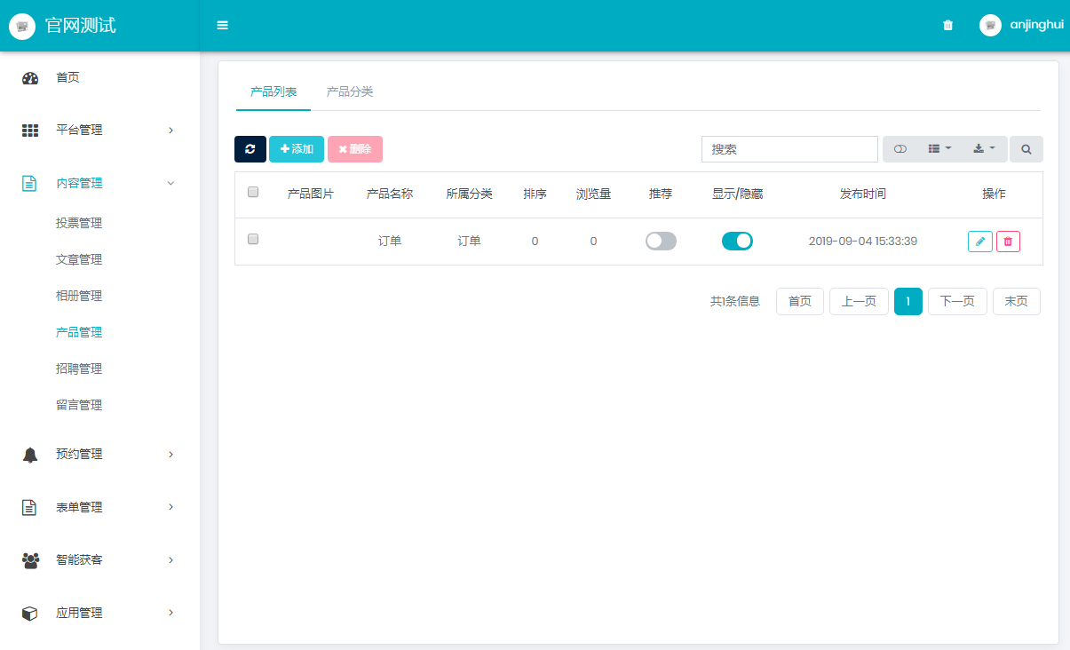 先添加产品分类之后,才可添加产品列表。推荐、显示\隐藏、编辑删除等功能。