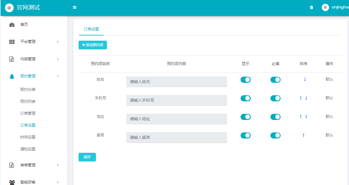 此页面主要实现预约信息获取内容有哪些,默认字段有姓名,手机号,地址,留言内容可以根据个人需要选择显示、必填、排序等操作、也可根据个人需要增加需要获取的预约项,点击添加预约项进行添加,