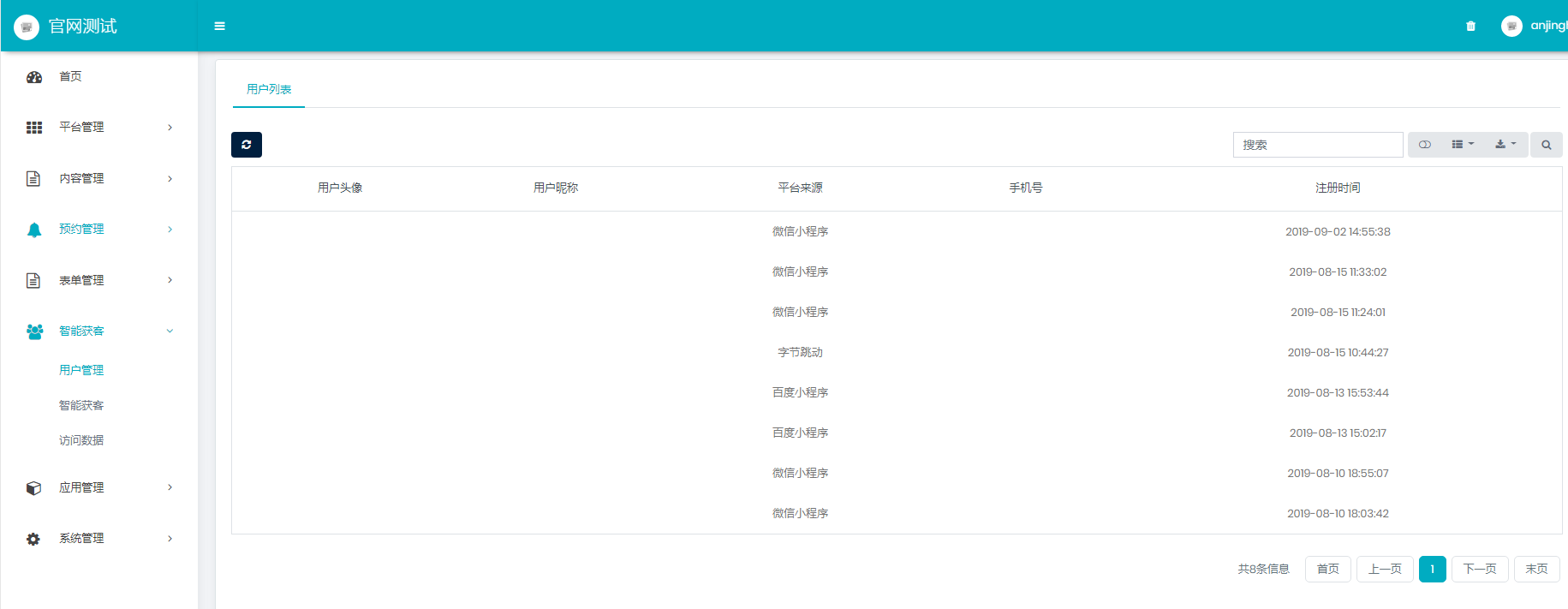 通过后台配置授权,获取访问小程序用户的用户头像,用户昵称、平台来源、手机号、注册时间