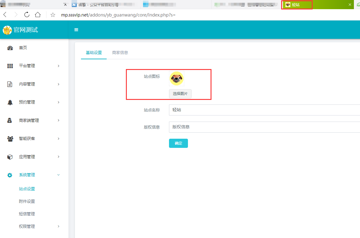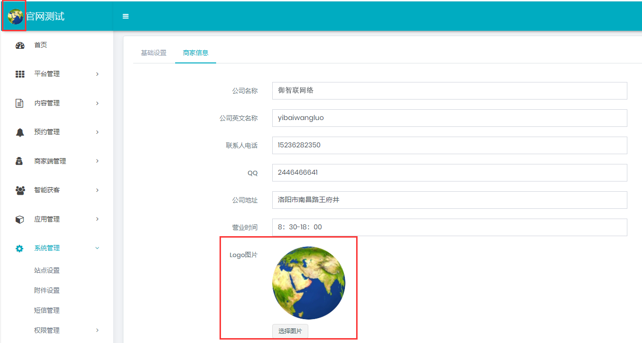 站点设计分为基础设计和商家信息 基础设置: 设置导航栏图标、标题名称、小程序端的底部版权设置 商家信息: 填写商家的名称、联系方式、地址等基本信息。商家信息没有详情页,并不记录以往填写的商家信息,不显示修改记录。 设置图片也将在后台的左上角显示。 小程序端的个人中心页面标记的信息都是通过商家信息获取数据的。