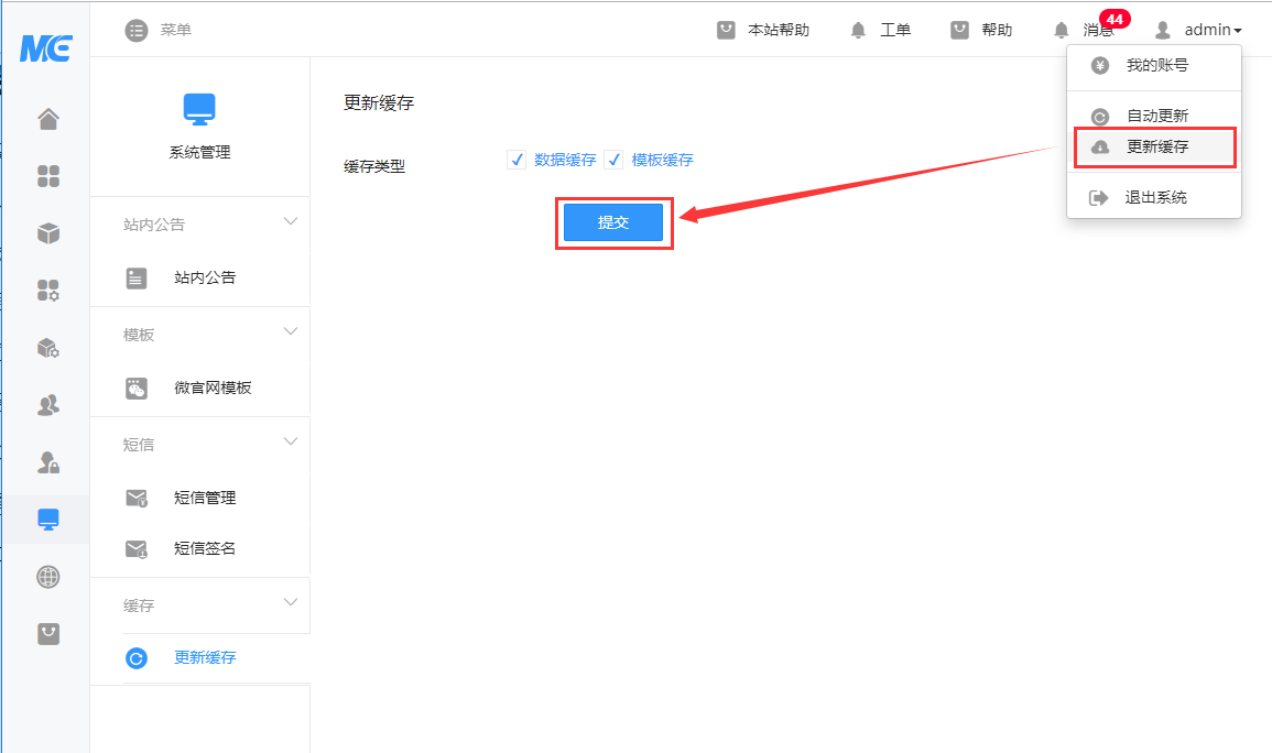 一、点击右上角“更新缓存”,在打开页面点击“提交”按钮