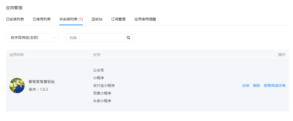 二、在应用管理页面,"未安装列表"里找到轻站应用,点击安装即可