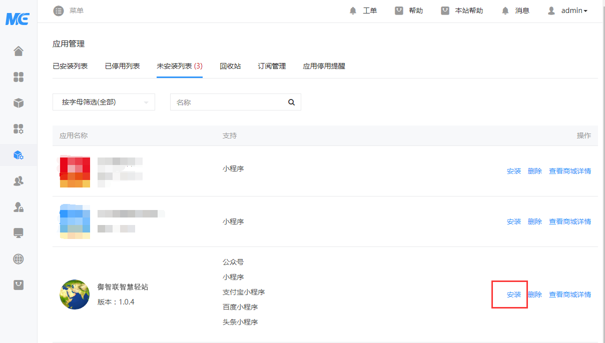 登录微擎站点后台,点击左侧菜单“应用管理”,在打开的页面选择“未安装列表”,找到“御智联智慧轻站”,点击后边的“安装”字样。