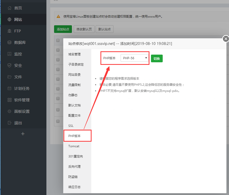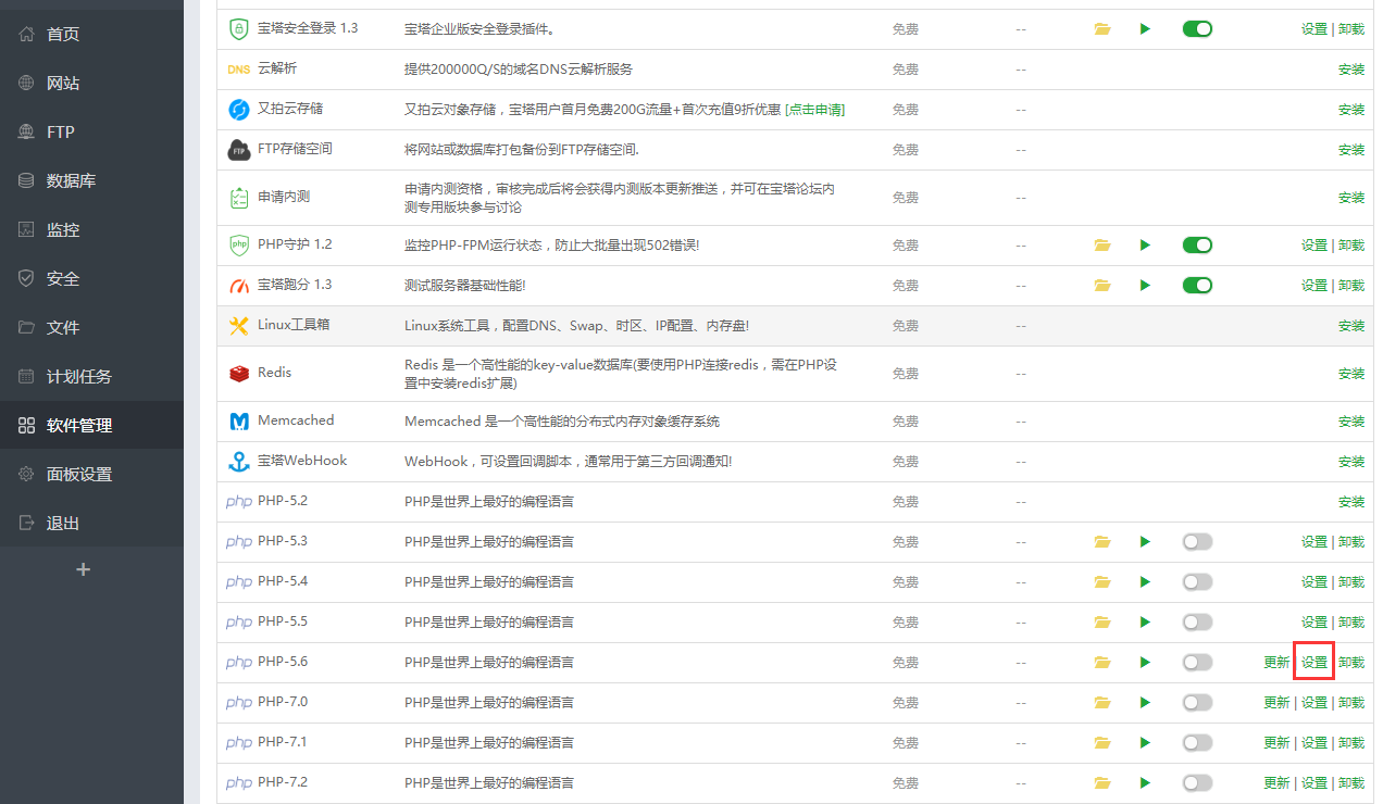 一、登录宝塔面板,查看站点使用的哪个版本的PHP 二、打开软件管理页面,找到对应的PHP版本,点击设置