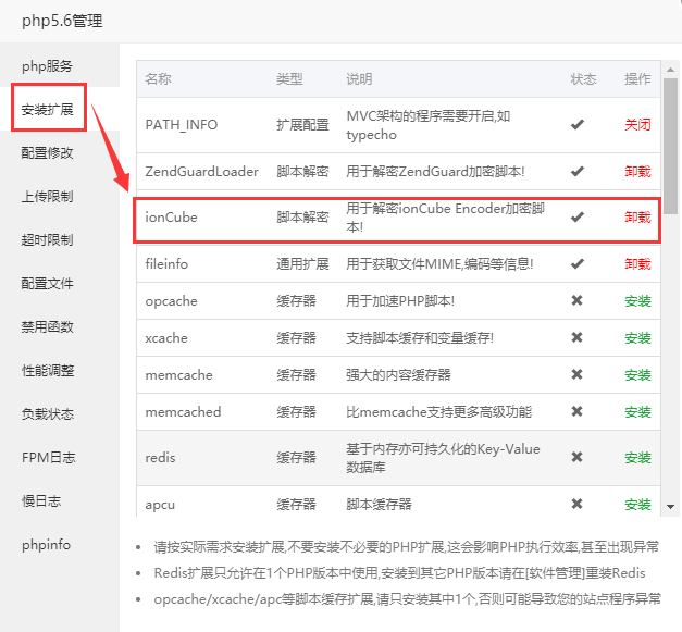 三、找到安装扩展选项卡,查看ioncube插件是否安装,如果未安装的话,点击安装,然后重启PHP即可。