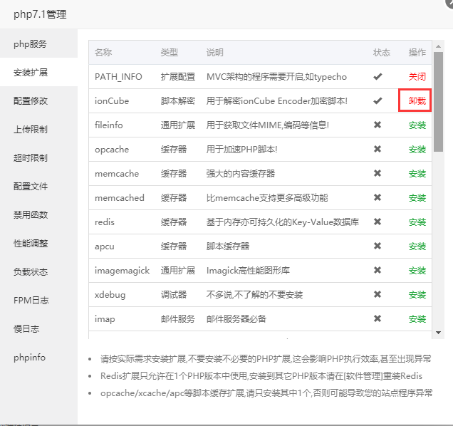 打开php管理的安装扩展选项卡,找到ionCube插件,卸载,然后重新安装