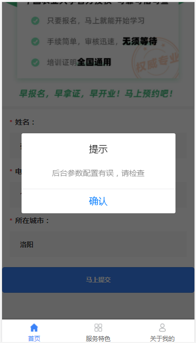 如图所示,在H5页面上填写完表单,提交时提示“后台参数配置有误,请检查”