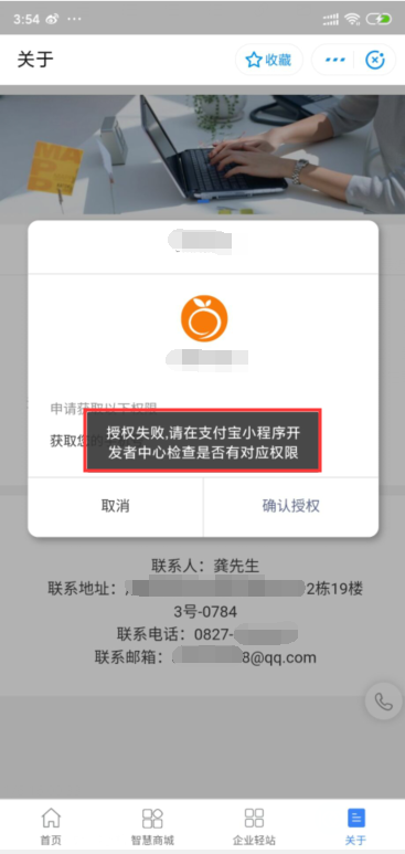如图所示,在支付宝小程序端确认授权时提示:授权失败,请在支付宝小程序开发者中心检查是否有对应权限