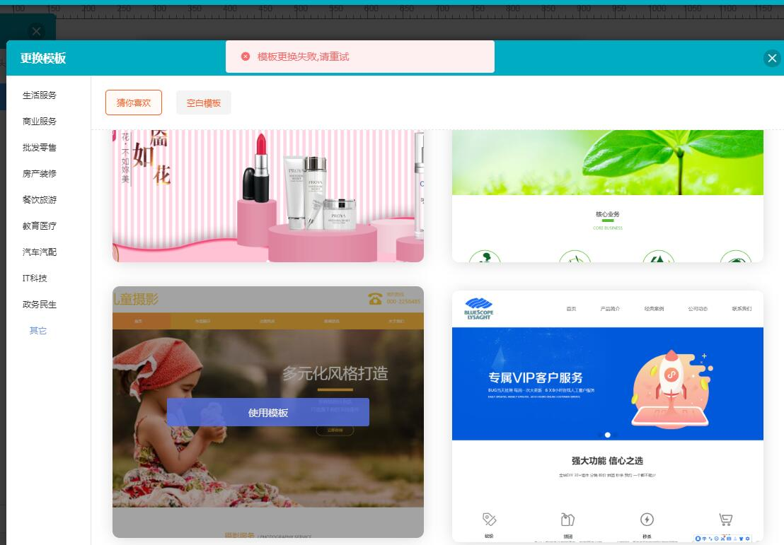 如图所示,PC端更换模板时提示【模板更换失败,请重试】