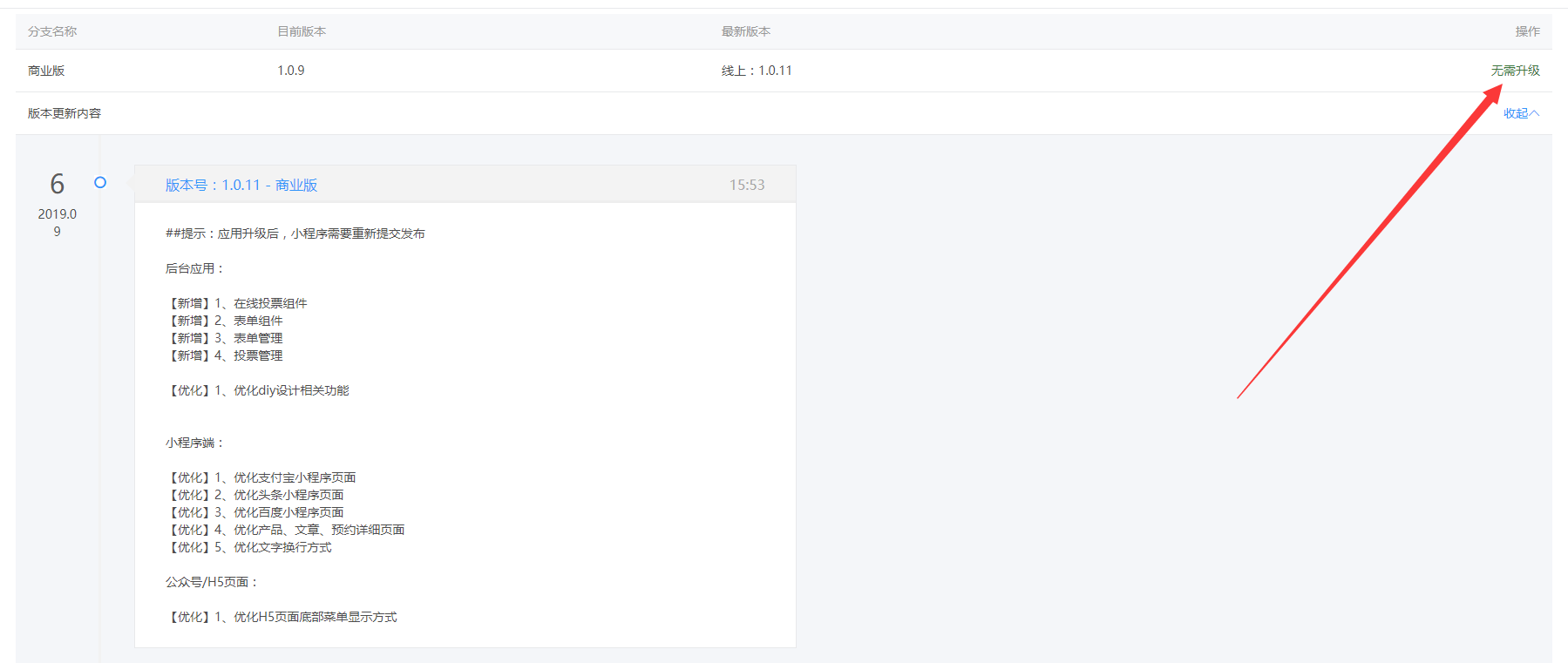 微擎提示应用有更新,打开详情页面却显示“无须更新”
