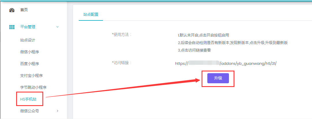 升级应用之后,增加了新功能或是BUG问题有了修复,小程序端有明显的变动,但是H5和公众号页面却跟以前一样,怎么刷新都没有变化,因为H5/公众号页面需要单独升级,如下图所示,点击“升级”按钮即可。