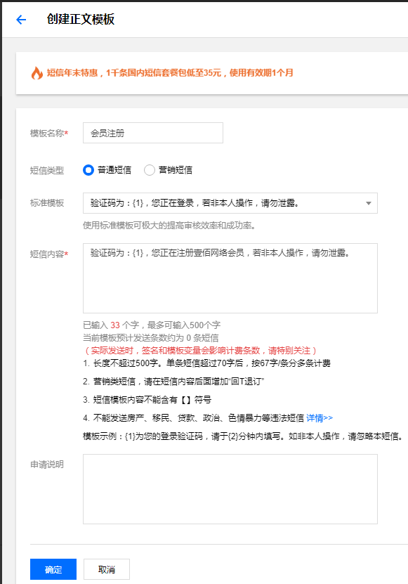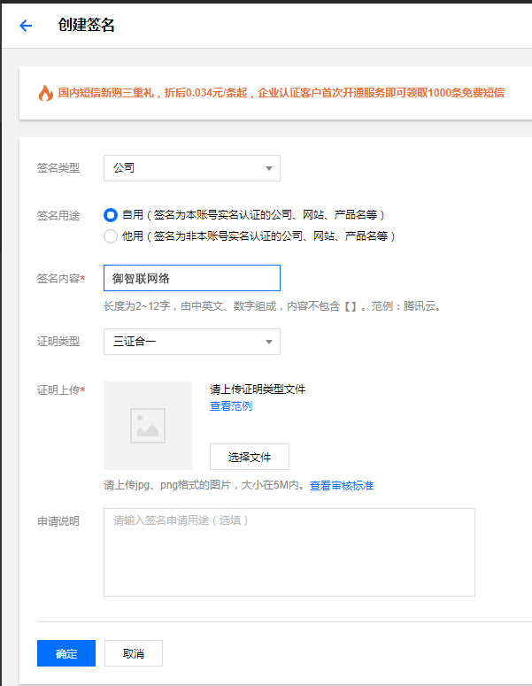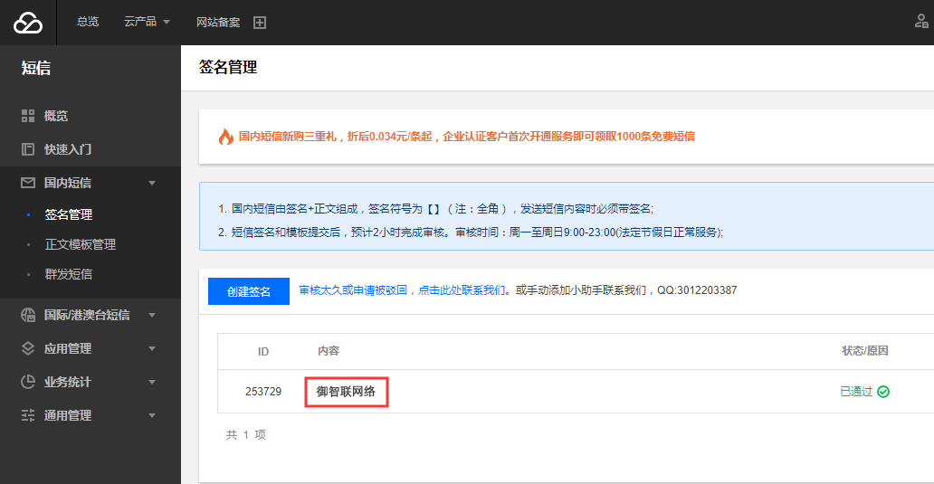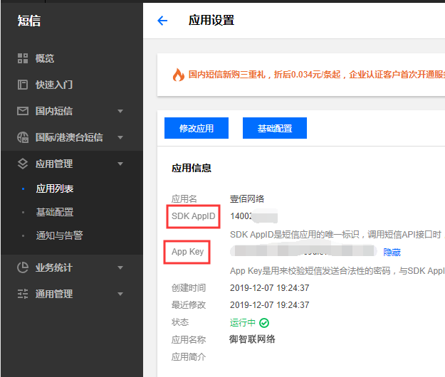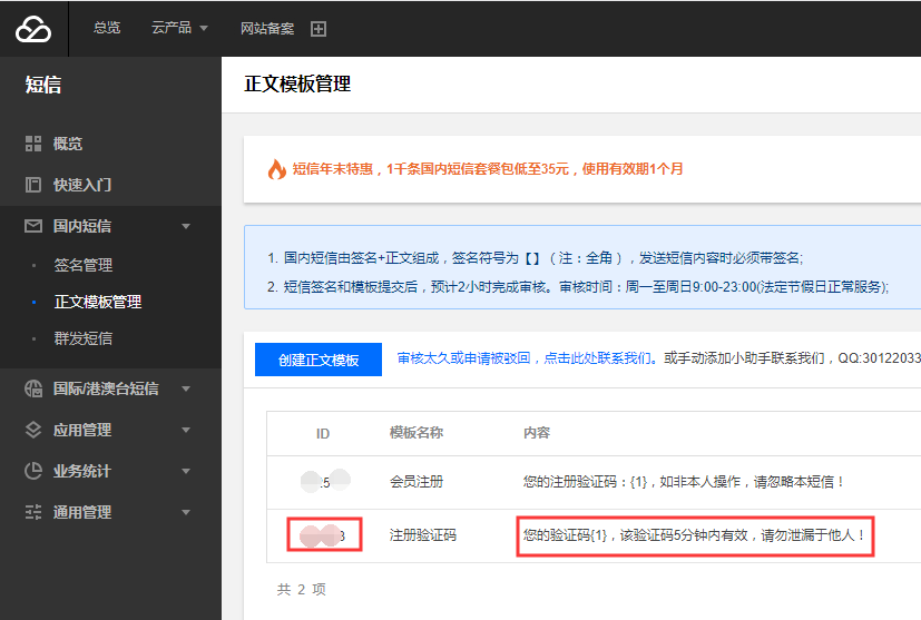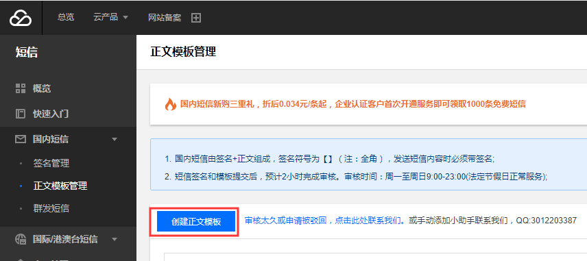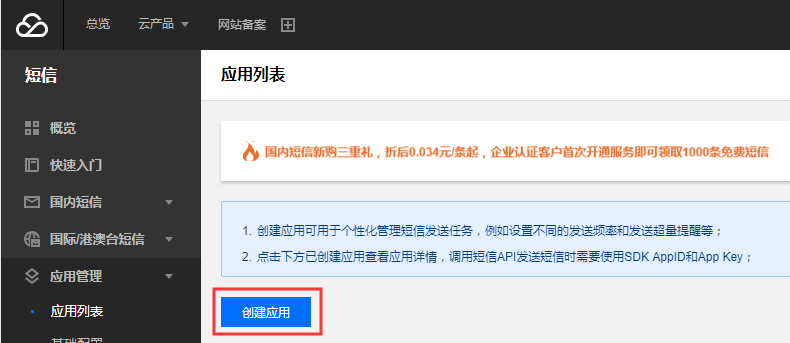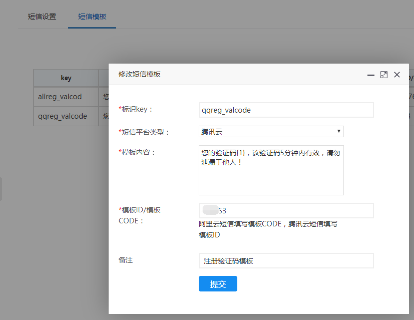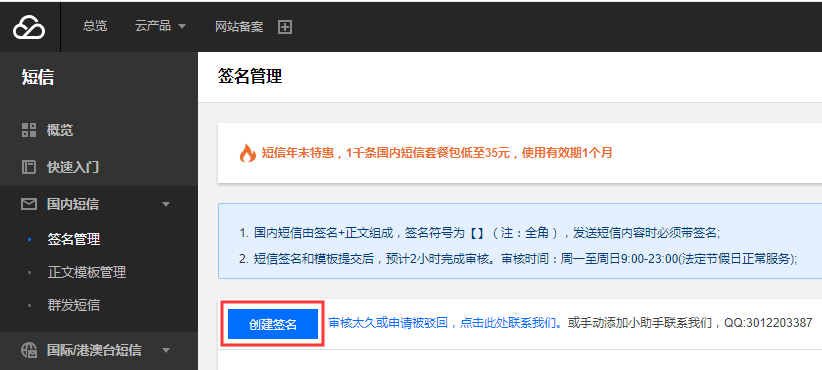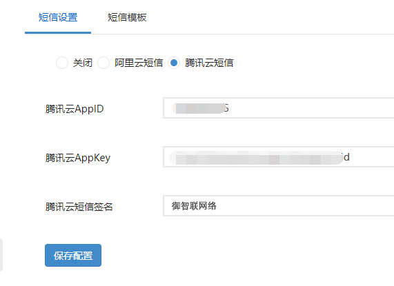 一、登录腾讯云账号,在控制台首页搜索“短信”或是下方的“短信”快捷方式,登录短信服务控制台。(需要提前购买短信服务套餐) 二、【应用管理】-【创建应用】 三、【国内短信】-【创建签名】 四、【正文模板管理】-【创建正文模板】,可选用系统的标准模板 五、等签名和模板审核通过之后,将AppID、AppKey、短信签名、短信模板复制到后台的短信配置页面