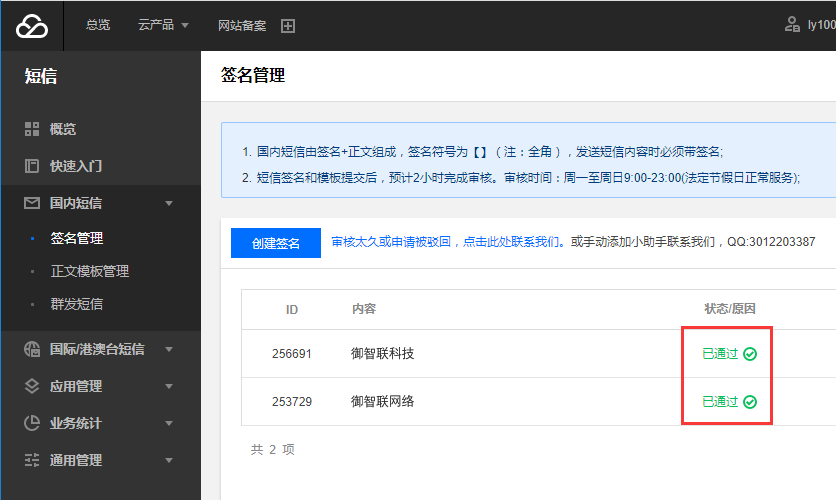 一、检查短信签名和短信模板是否已经审核通过