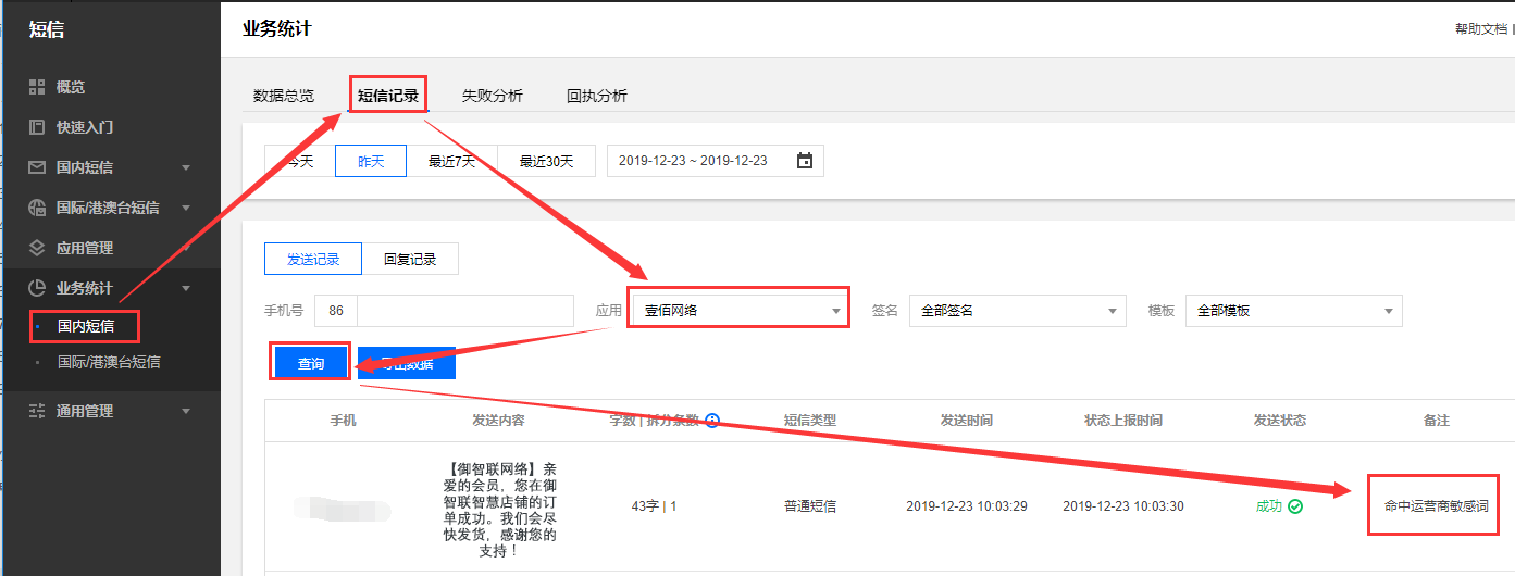 二、检查短信签名或是模板是否命中运营商敏感词(提交短信服务商工单可恢复)