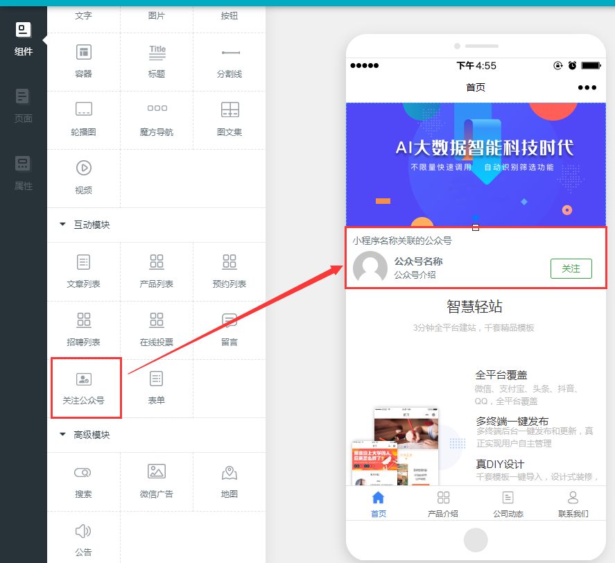 三、登录门店后台,在首页上添加【关注公众号】组件,保存,扫码预览小程序可看到效果(直接打开小程序是看不到效果的,需要扫码预览)