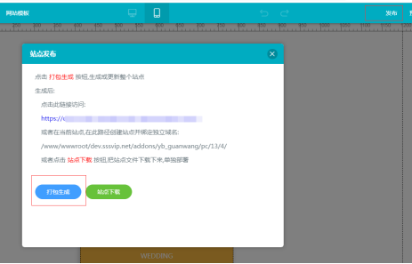 3、路径填写完成点击发布,选择打包生成后,可在手机端进入链接查看。