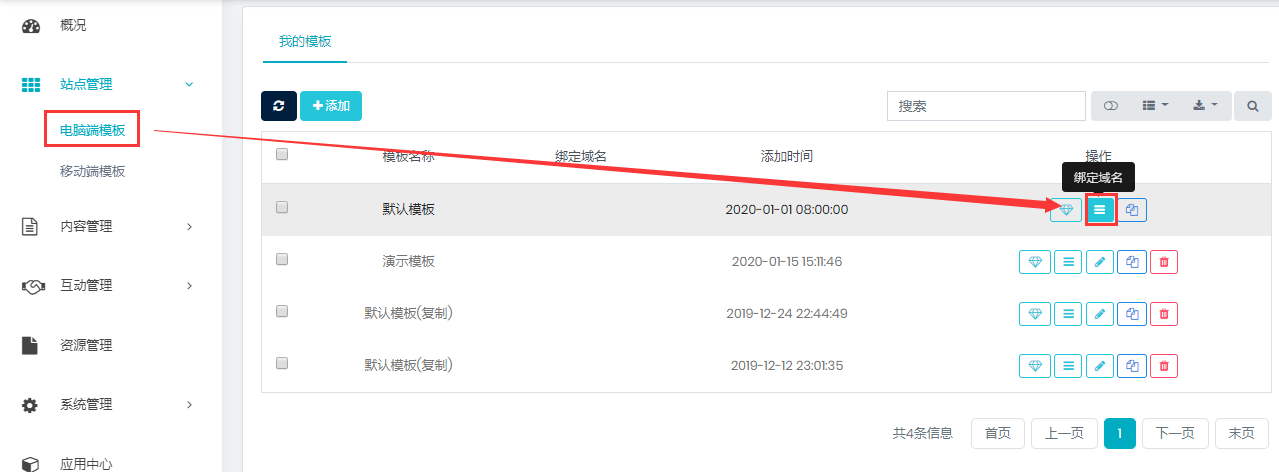 七、打开轻站后台【站点管理】-【电脑端模板】页面,选择相应的模板,进行域名绑定操作