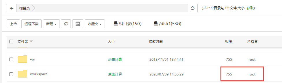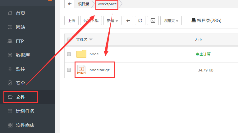 二、登录宝塔面板,打开文件管理页面,在服务器根目录下创建域名绑定服务文件夹workspace,然后上传nodeJS压缩包并解压