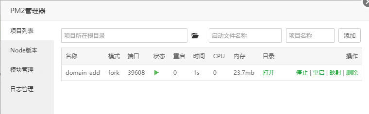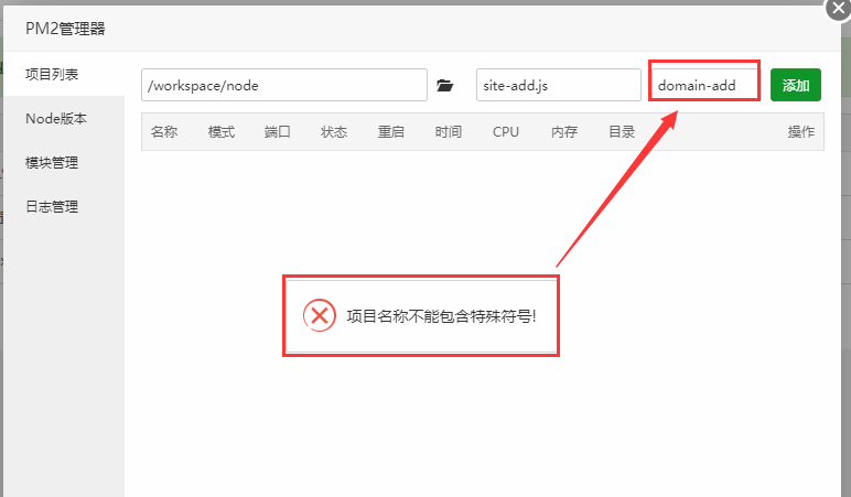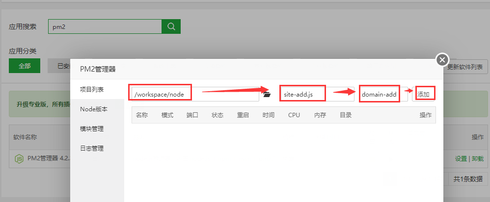 三、点击PM2设置,选择nodeJS所在目录/workspace/node,填写启动文件名称site-add.js,填写项目名称domain-add,然后点击【添加】