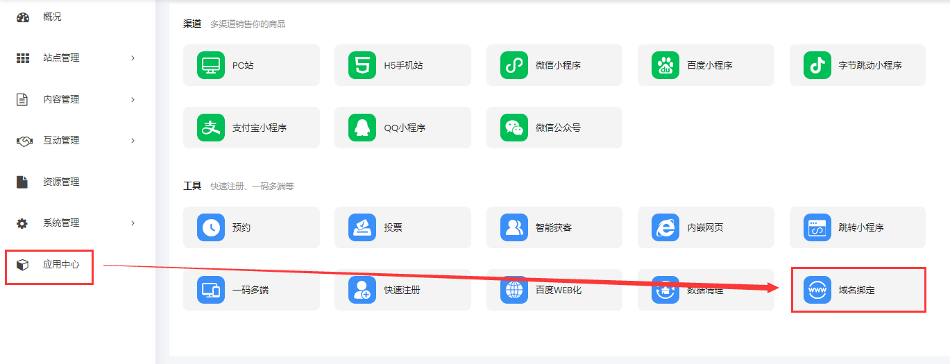 五、登录轻站后台【应用中心】-【工具】-【域名绑定】,开启相关服务