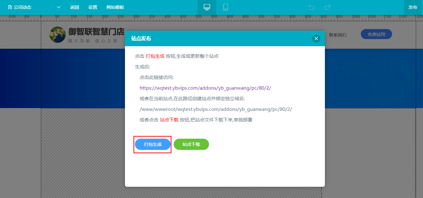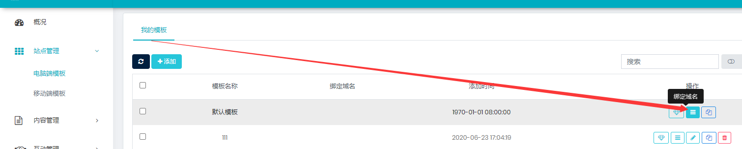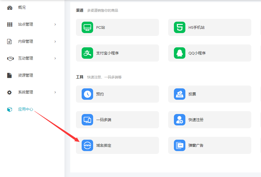 一、域名需提前解析指向服务器IP 二、打开轻站后台【应用中心】域名绑定页面,开启【域名绑定】服务 三、PC模板需要打包生成 四、在需要绑定域名的PC模板上添加域名绑定 五、在浏览器地址栏输入域名访问测试是否正常