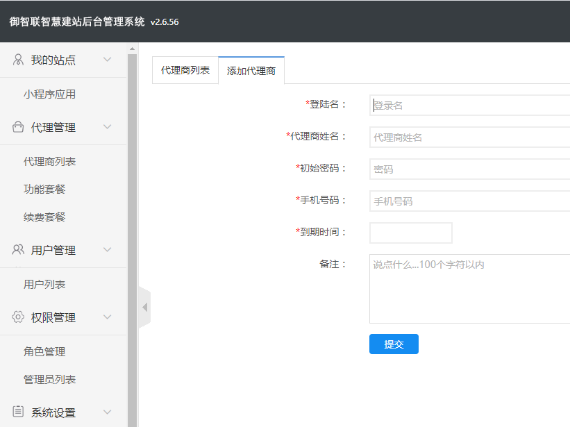 一、填写登录名、代理商姓名、初始密码、手机号,并设置到期时间和备注,【提交】保存即可