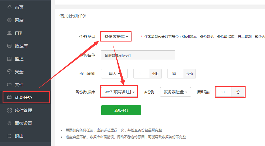 一、登录宝塔面板,打开【计划任务】,任务类型选择【备份数据库】,设置备份周期,如【每天】,选择需要备份的数据库,每天备份的话,建议保留最新【30份】,点击【添加任务】