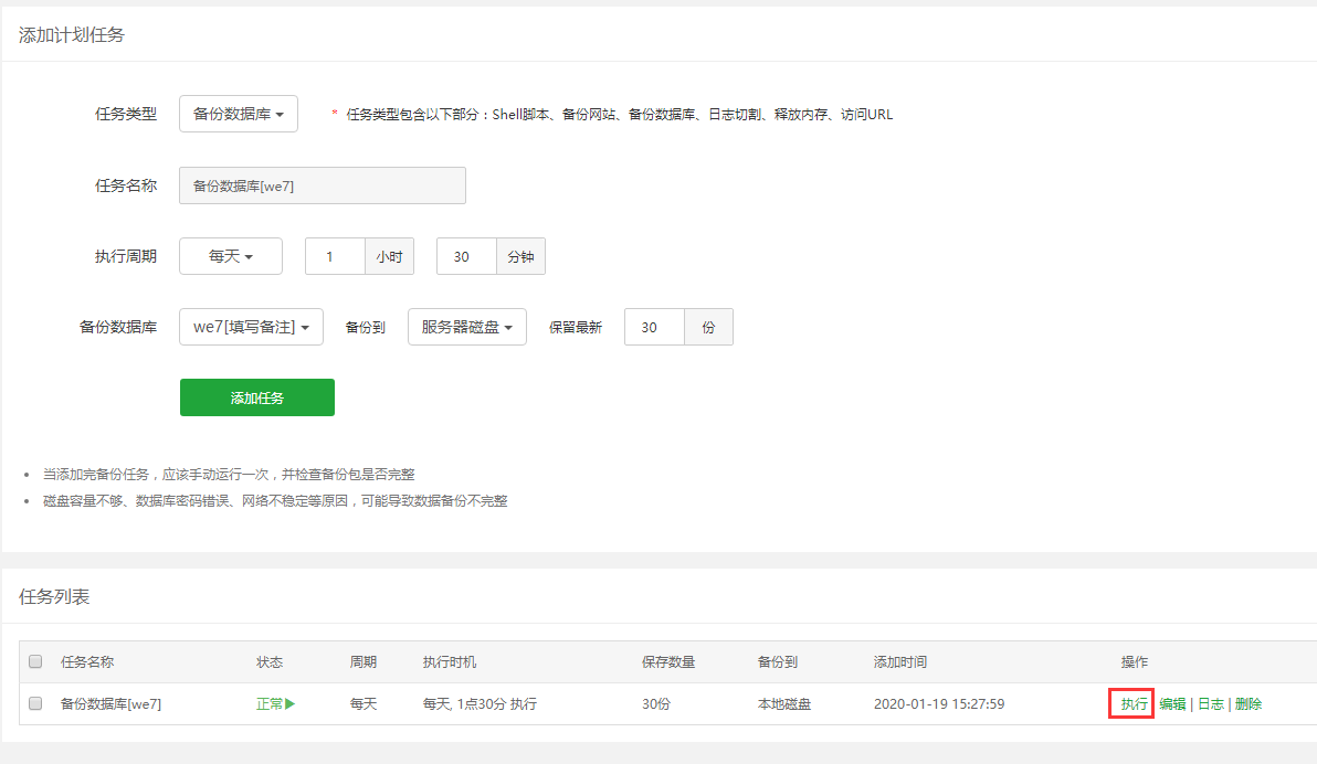 二、在任务列表找到刚创建好的任务,操作【执行】