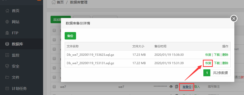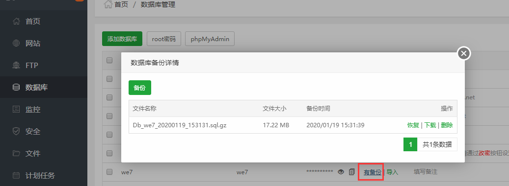三、打开数据库管理页面,查看数据库备份文件是否创建成功,以及数据库大小是否异常,一般几B或几K的数据库大小是有问题的,可再次手动执行备份。(如果数据库较大的话,可能会有一分钟左右的延迟)